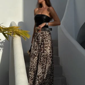 UNIZERA Leopard Satin with Belt High Waisted Trousers Wide Leg Pants Women's Clothing 2025 Summer New Arrivals Casual Pants